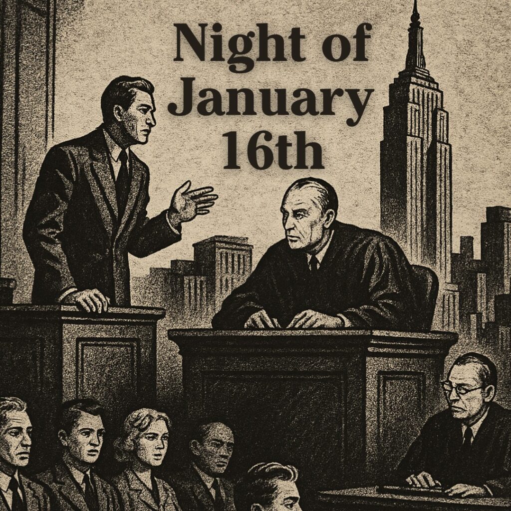 Audition: The Night of January 16th by Ayn Rand We’re short a few roles. Please contact the director Johann Van